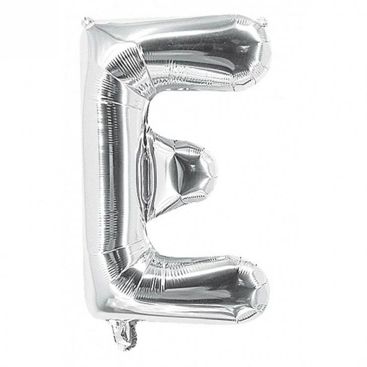 Ce ballon en forme de lettre E est argenté.