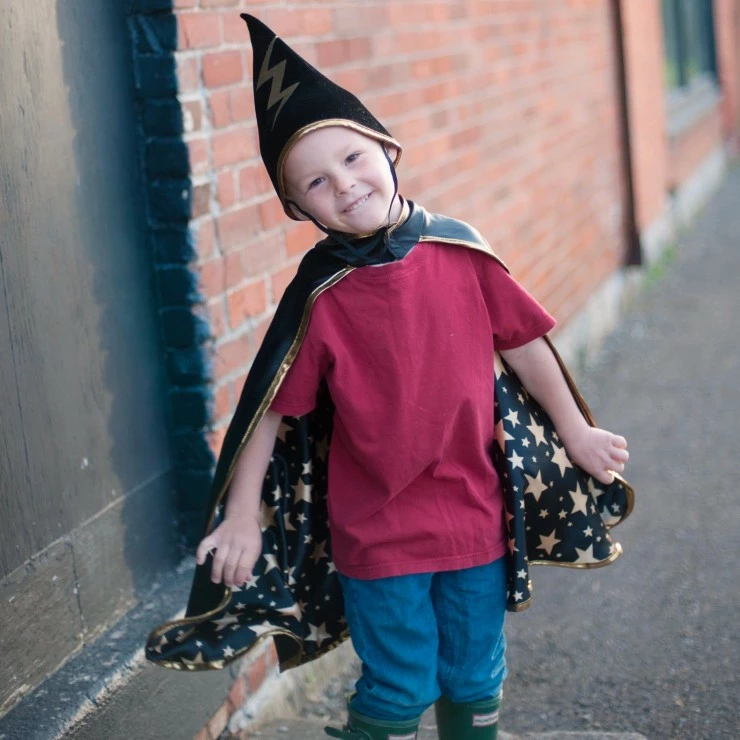 Le chapeau de sorcier se maintient grâce à une mentonnière élastique douce.