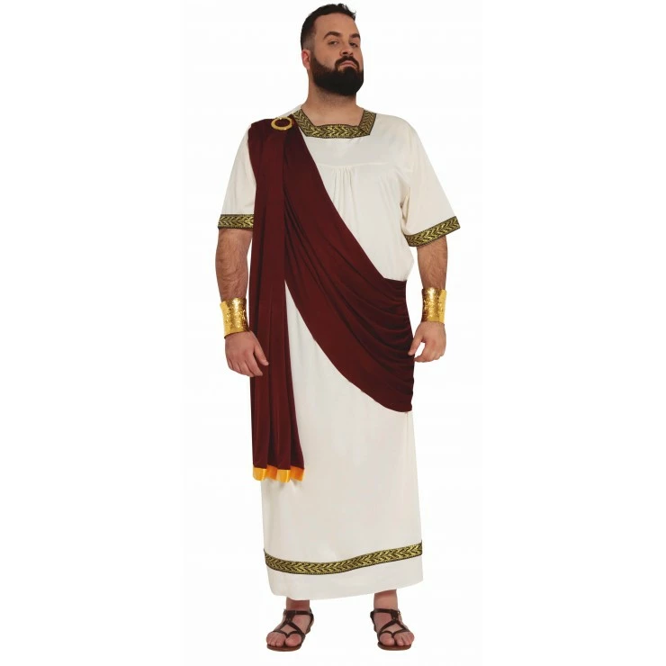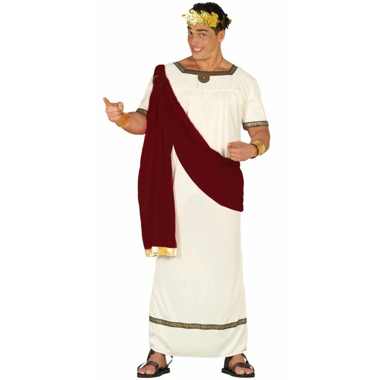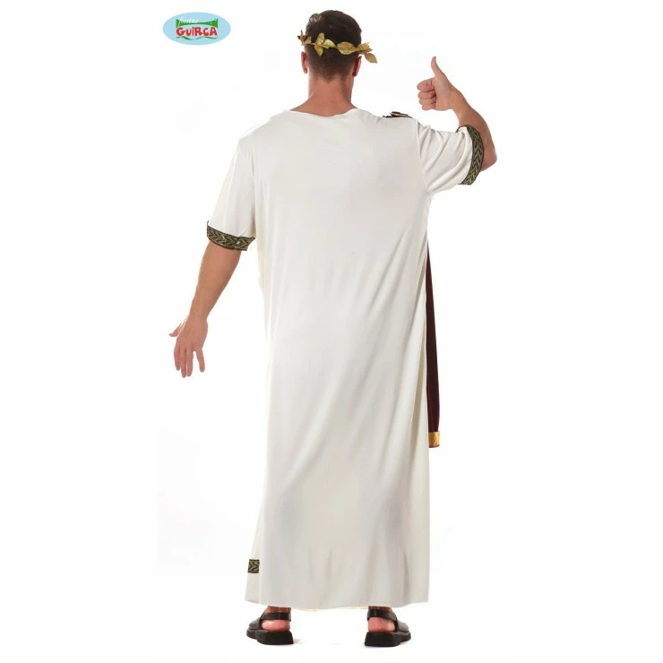Ce déguisement de César ou Auguste, illustres empereurs de l’empire Romain, comprend une longue tunique blanche décorée de Bandes aux motifs dorés.