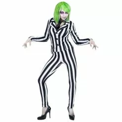 Ce déguisement élégant blanc à rayures noires comprend une veste, un pantalon et une cravate.