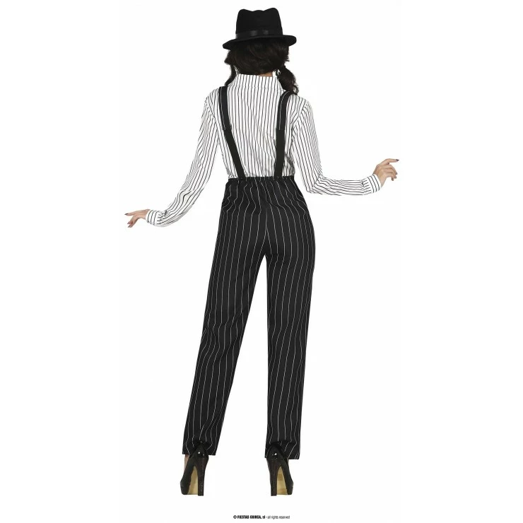 La chemise est blanche à rayures noires et le pantalon, noir à rayures blanches.