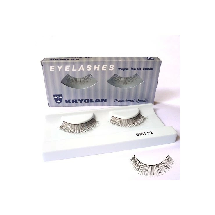 Paire de faux cils professionnels Kryolan fashion F2. Faux cils bruns foncés, droits et noués avec une importante graduation. Aspect naturel volumineux.