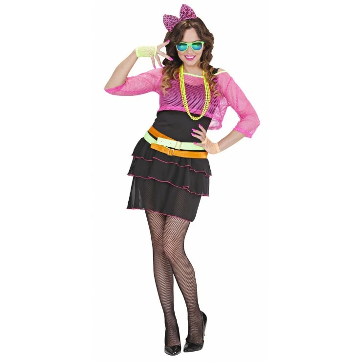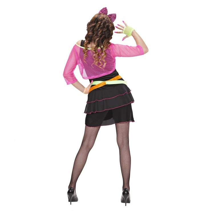 Ce costume eighties comprend une robe noire, un gilet filet rose fluo, une double ceinture fluo et un serre-tête nœud léopard rose.
