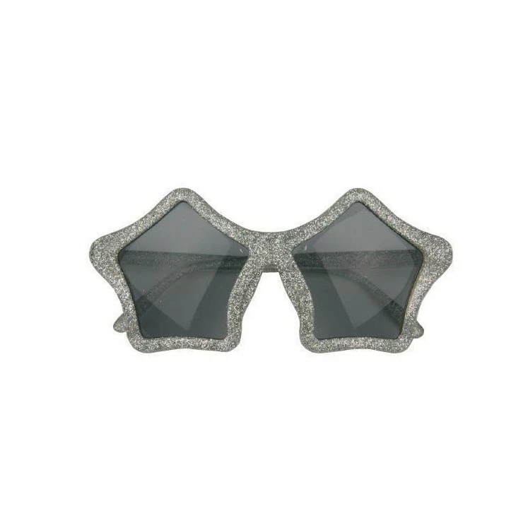 Cette paire de lunettes comprend des verres teintés gris et une monture en forme d’étoiles argentées et pailletées.