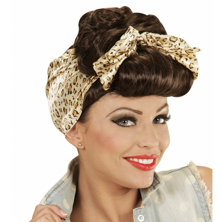 Cette perruque Rockabilly pin up brune intègre un bandeau léopard.