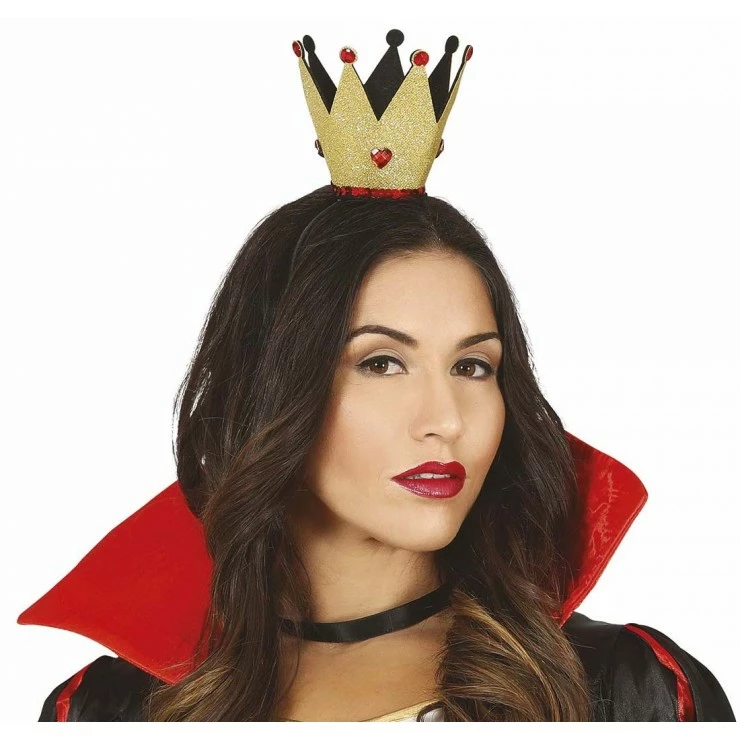 Cette mini couronne sur serre-tête est dorée et décorée de fausses pierres précieuses rouges.
