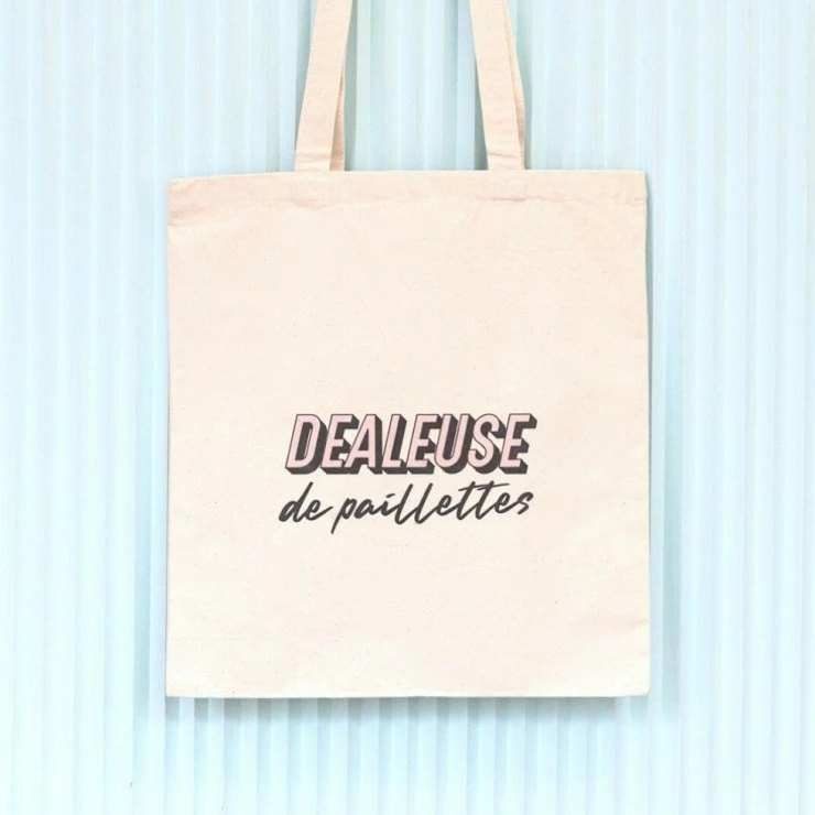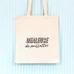 Il est imprimé sur les deux faces : Dealeuse de Paillettes d’un côté, et notre superbe logo 80s de l’autre.